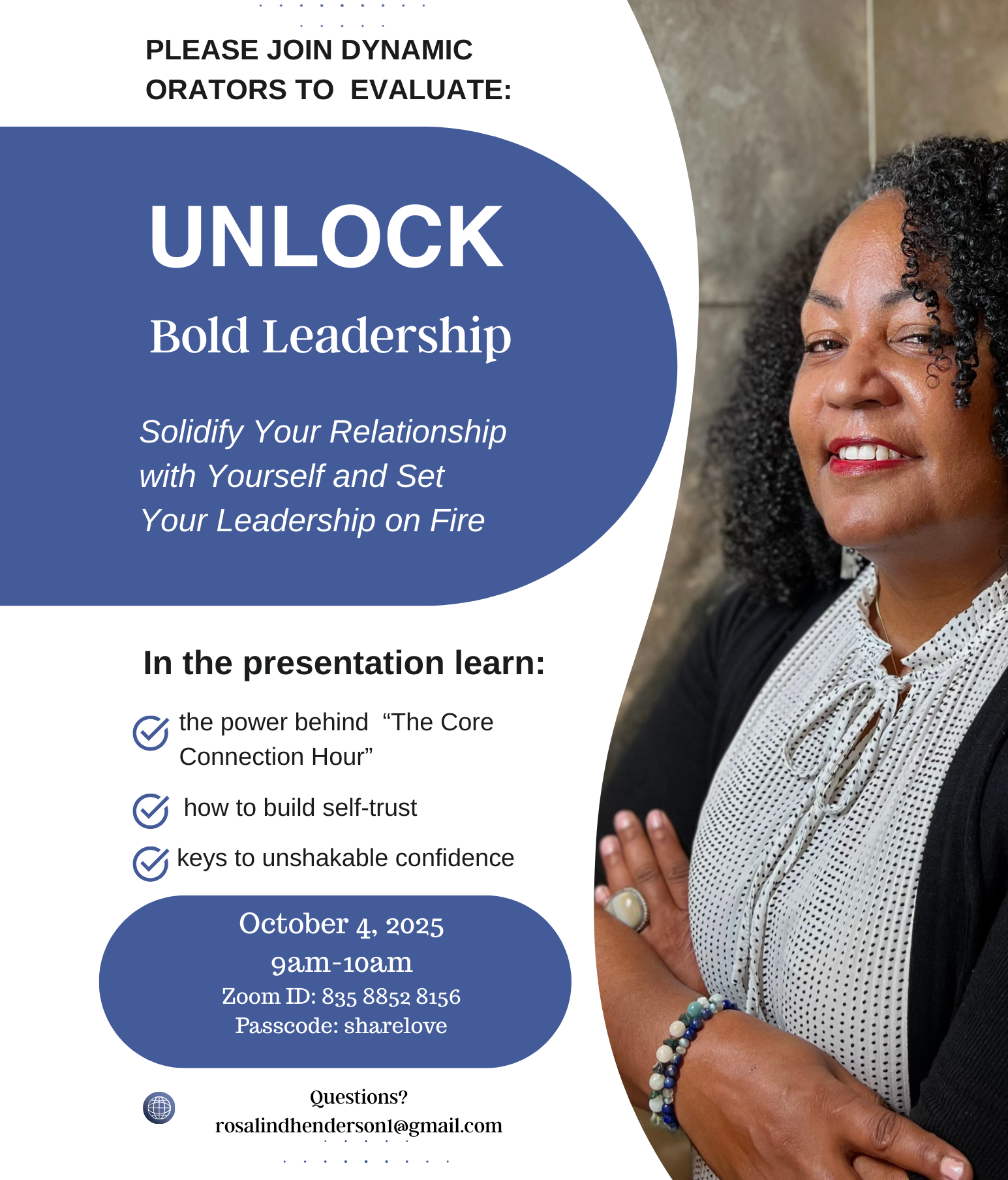 Long-time Toastmasters, Rosalind Henderson, is presenting a 30 min. speech on Bold Leadership and she needs your suggestions to help her improve. Feel free to forward this email to anyone who might be interested.