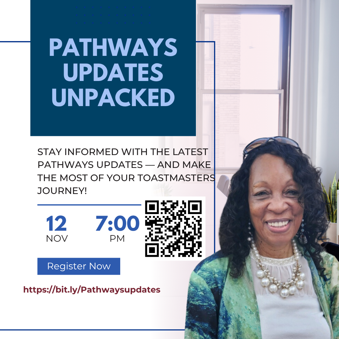 Stay informed and ahead of the curve! Join us for an interactive session introducing the newest updates and enhancementsto the Toastmasters Pathways learning experience. Whether you’re a seasoned member or just starting your journey, this workshop will help you navigate the changes, explore new learning paths, and make the most of your personal and professional growth through Pathways.